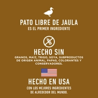 Carne de pato, harina de carne de pavo, harina de carne de pollo, chicharos, huevos de gallina, aceite de canola (conservada con tocoferoles mixtos y ácido cítrico), harnina de carne de pato, tapioca, pure de tomate deshidratado, sabor natural, garbanzos, arcilla montmorrillonita, sal, cloruro de potasio, vitaminas (suplemento de vitamina e, suplemento de niacina, l-ascorbilo-2-polifosfato, mononitrato de tiamina, pantotenato de calcio, suplemento de vitamina a, suplemento de riboflavina, clorhidrato de piridoxina, suplemento de vitamina b12, ácido fólico, suplemento de vitamina d3, biotina), zanahorias, manzanas, arándanos, minerales (proteinato de zinc, proteinato de hierro, proteinato de cobre, proteinato de manganeso, selenito de sodio, dihidroyoduro de etilendiamina), cloruro de colina, carne de pato liofilizado, semillas de calabaza, bacillus coagulans secos, extracto de romero.